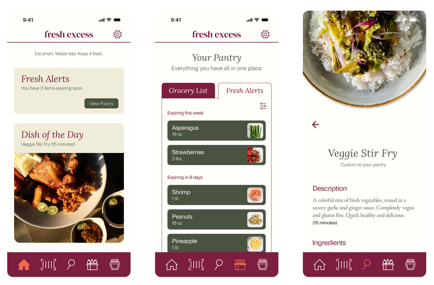 Fresh Excess is a smart food management app designed to help users reduce food waste by tracking groceries, sending expiration alerts, and recommending meals based on the ingredients they already have.